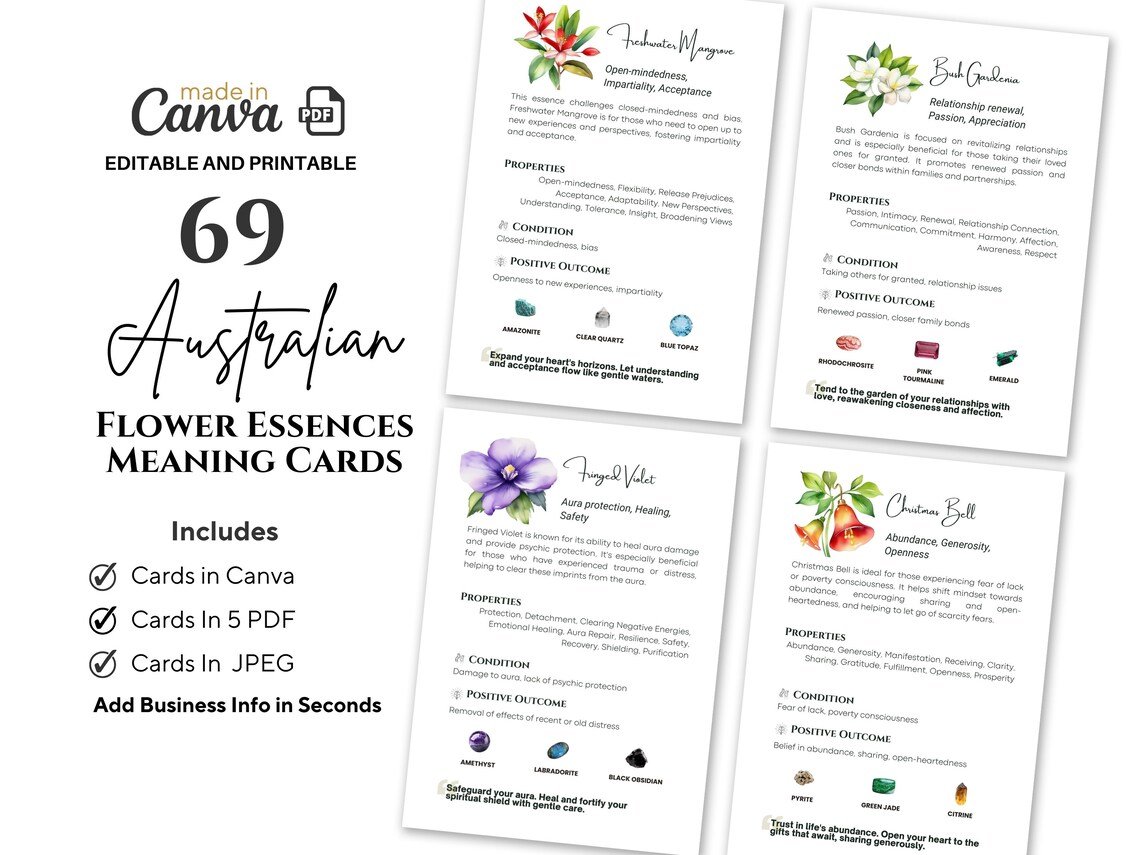 69 Australian Bush Flower Essences with Crystals A6 Size ,Apothecary herb meaning cards, Editable Herbalism Cards, Botanical info cards