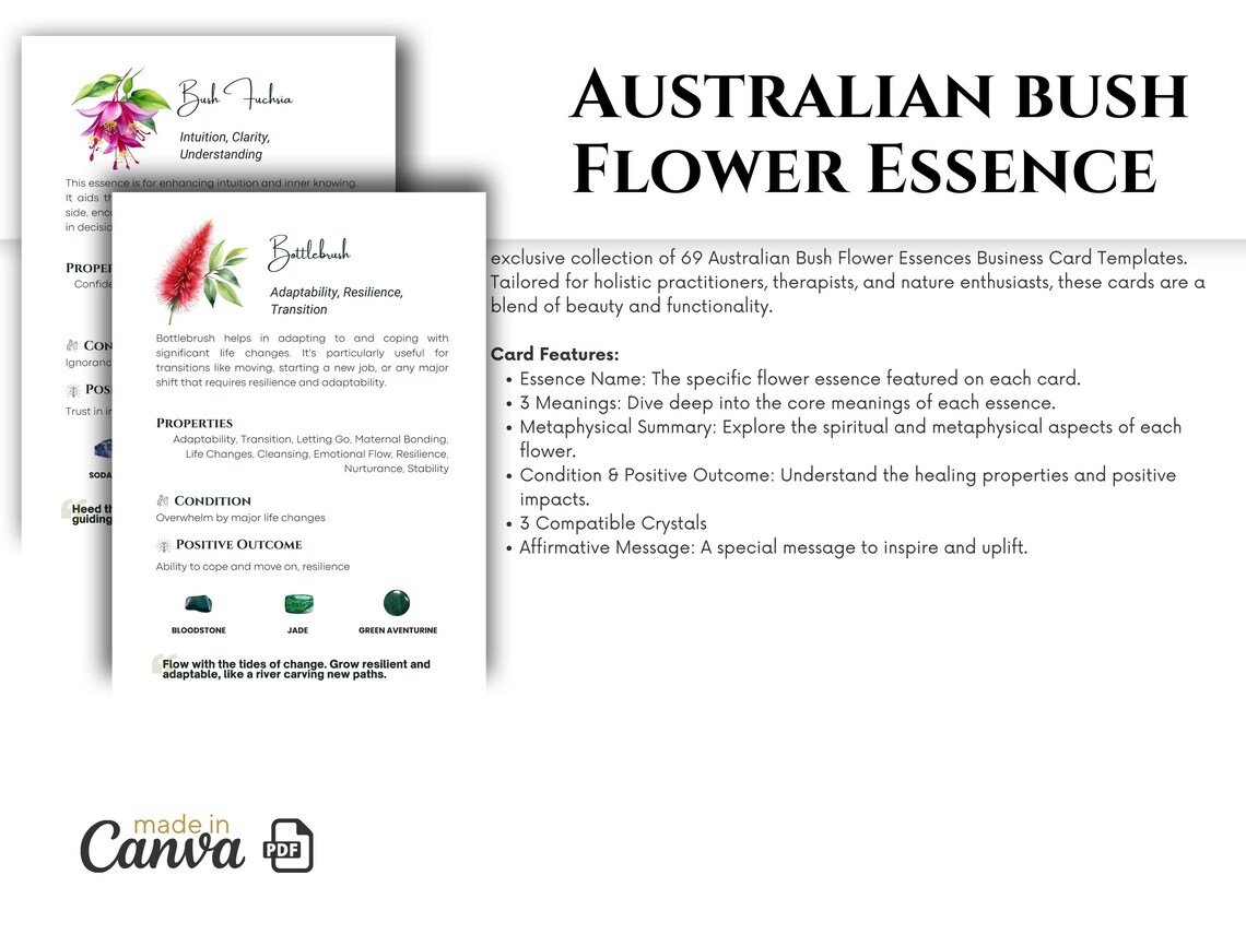 exclusive collection of 69 Australian Bush Flower Essences Business A6 Templates. Tailored for holistic practitioners, therapists, and nature enthusiasts, these cards are a blend of beauty and functionality.