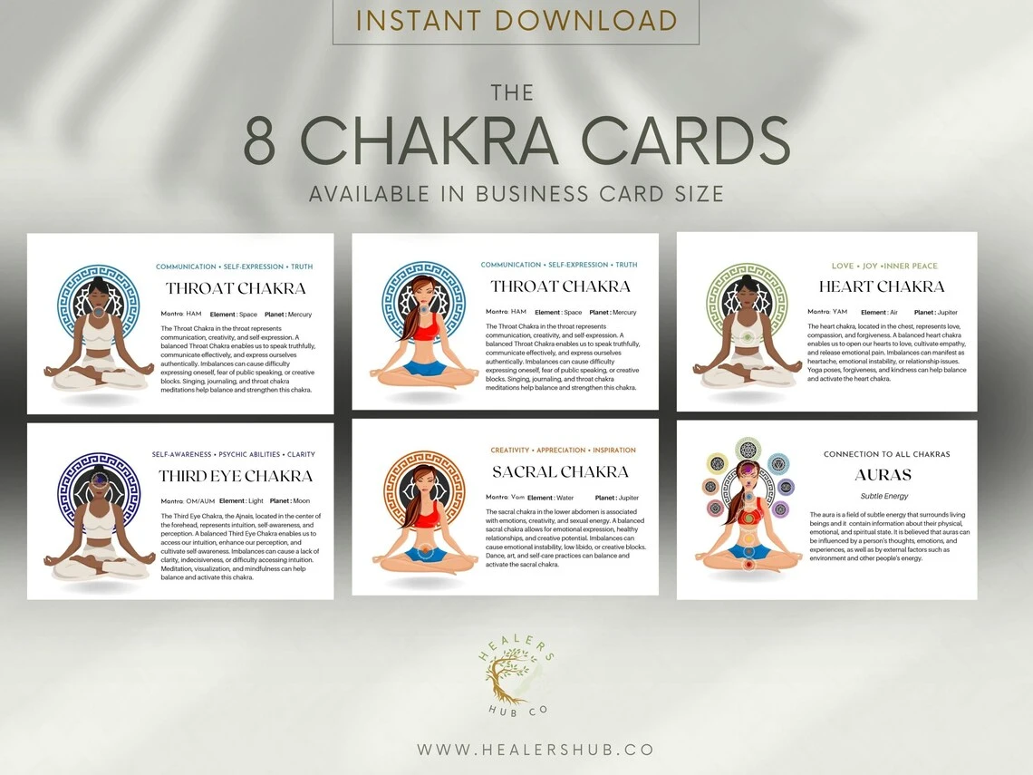 Introducing our 8 Chakra Cards – a comprehensive and visually appealing guide to understanding, balancing, and enhancing your chakra system. These beautifully designed digital cards from HealersHub Co are tailored to provide detailed information on each chakra, making it easy to harness their energy and unlock your full potential.