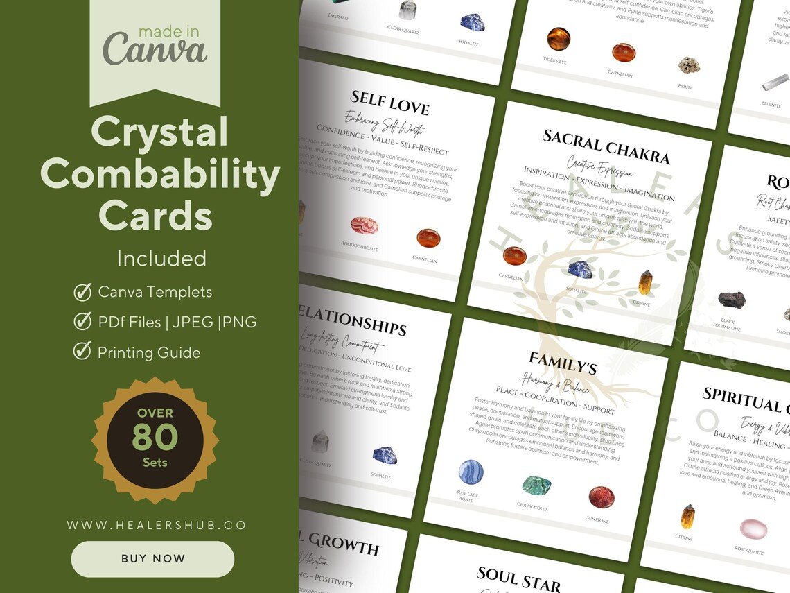 Empower your spiritual practice and deepen your understanding of crystals. Order our editable Digital Crystal Compatibility Card Set now and embark on a transformative journey of self-discovery and healing.