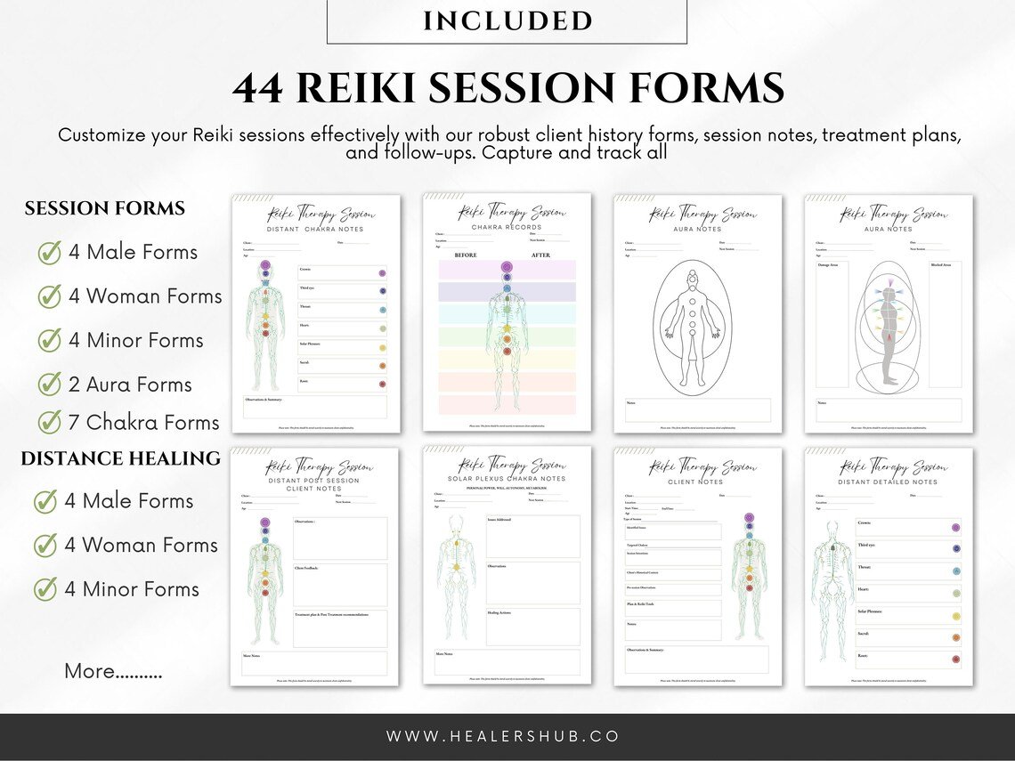 • 44 Reiki Session Forms: Customize your Reiki sessions effectively with our robust client history forms, session notes, treatment plans, and follow-ups. Capture and track all critical details, making your Reiki healing journey seamless and personal for each client.