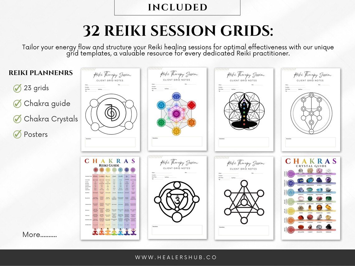 • 32 Reiki Session Grids: Tailor your energy flow and structure your Reiki healing sessions for optimal effectiveness with our unique grid templates, a valuable resource for every dedicated Reiki practitioner.
