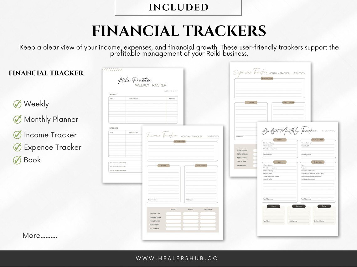 • 5 Financial Trackers: Keep a clear view of your income, expenses, and financial growth. These user-friendly trackers support the profitable management of your Reiki business.