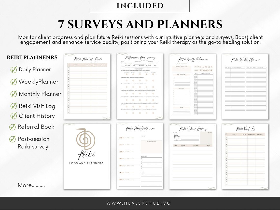 • 7 Surveys and Planners: Monitor client progress and plan future Reiki sessions with our intuitive planners and surveys. Boost client engagement and enhance service quality, positioning your Reiki therapy as the go-to healing solution.