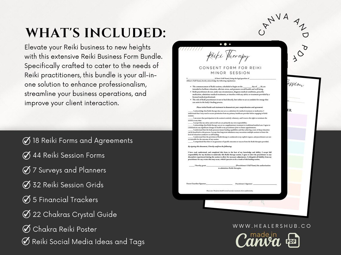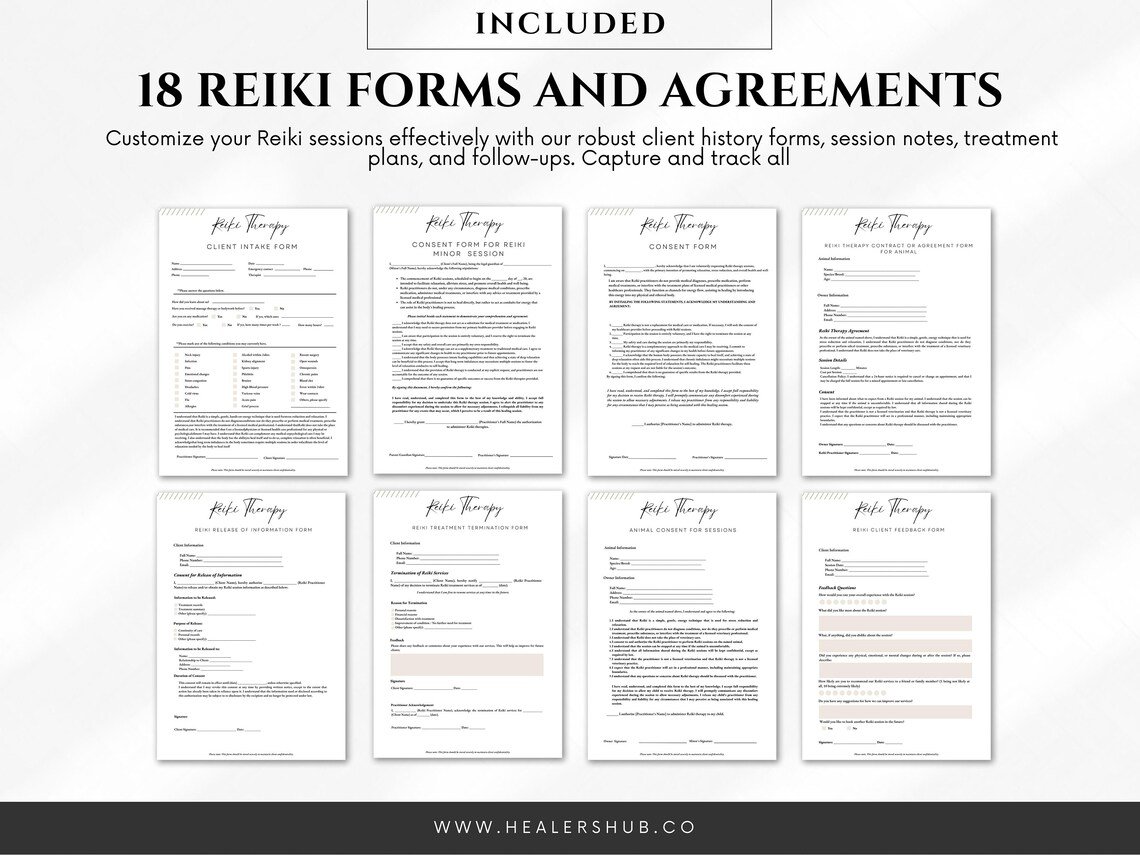 • 18 Reiki Forms and Agreements: These forms, covering consent, treatment protocols, privacy policies and more, establish a professional, secure, and trust-filled atmosphere for your Reiki healing services.