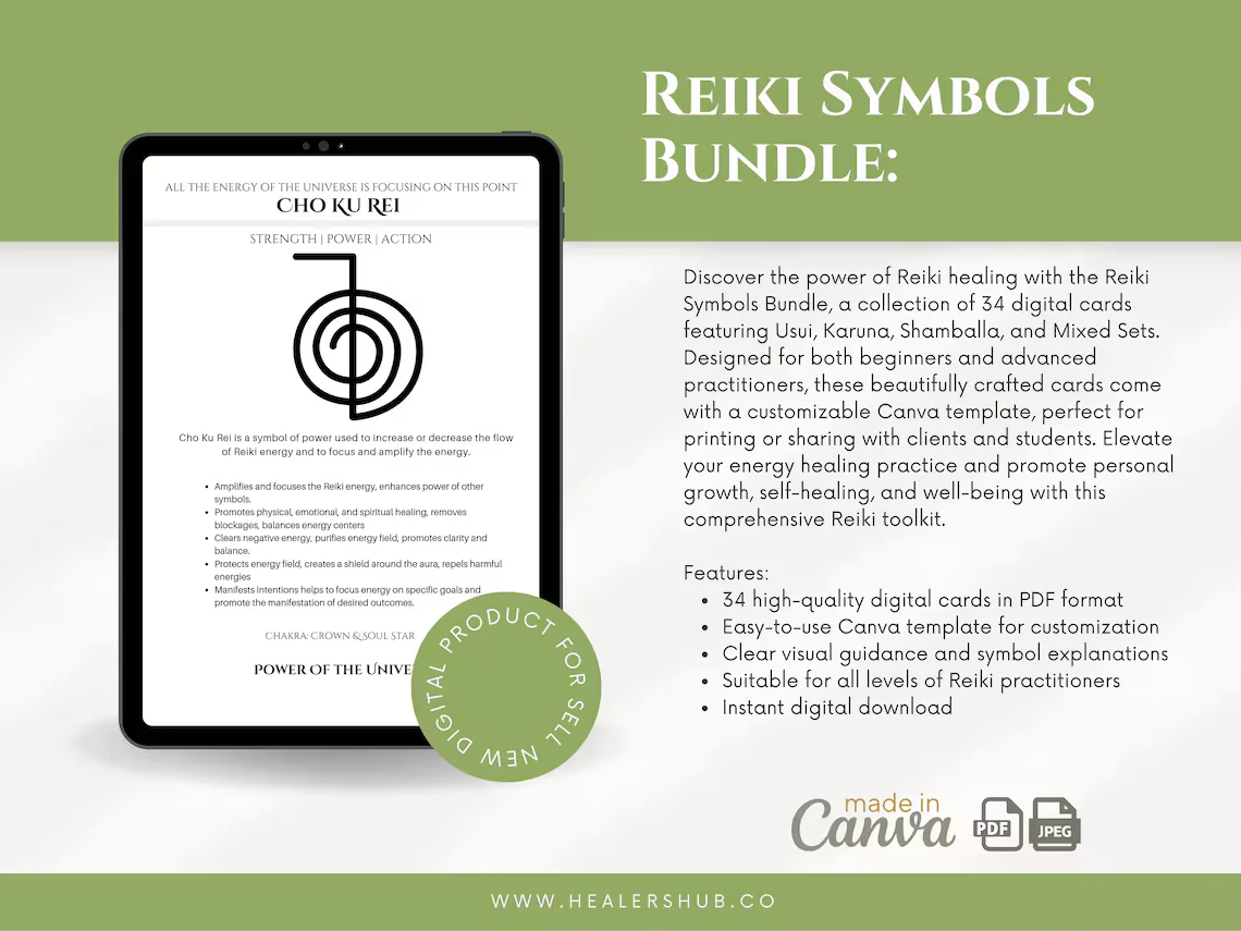 Discover the power of Reiki healing with the Reiki Symbols Bundle, a collection of 34 digital cards featuring Usui, Karuna, Shamballa, and Mixed Sets. Designed for both beginners and advanced practitioners, these beautifully crafted cards come with a customizable Canva template, perfect for printing or sharing with clients and students. Elevate your energy healing practice and promote personal growth, self-healing, and well-being with this comprehensive Reiki toolkit.